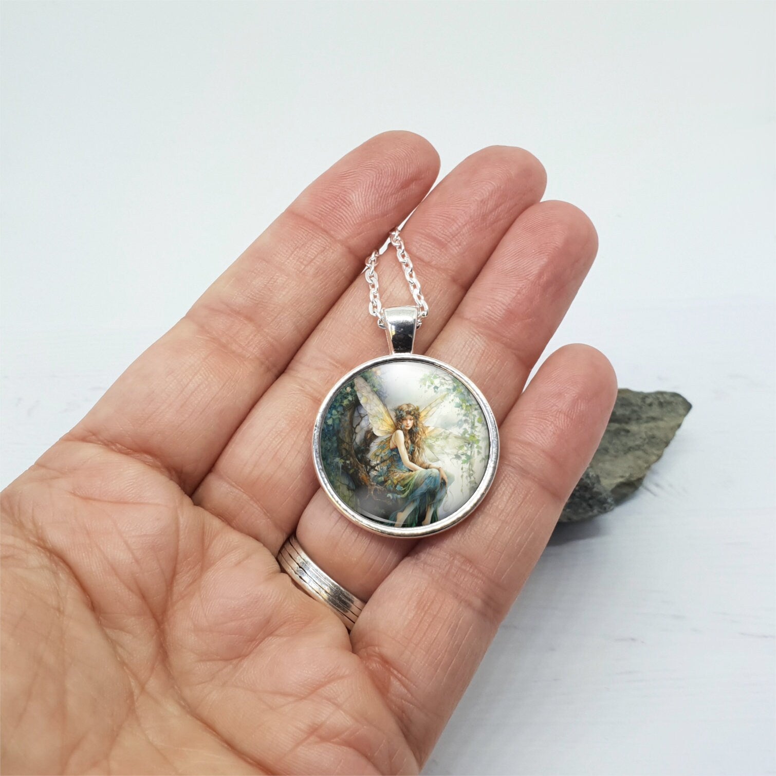 This pretty fairy necklace features an ethereal woodland fairy perched among the branches of a tree. Perfect for lovers of fairies, myth, and fantasy. This design is an exclusive, created by me.